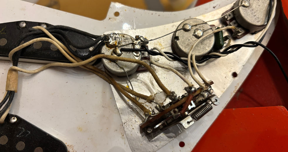 So I started the renovation by taking the neck off and remove the pickguard. Tolek told me the pickups couldn't be adjusted and, true enough, the pickup height rubber tubing was dried out and falling to bits so in went new rubber tubing and a new 5 way CTS switch. I changed the wiring so the bridge pickup was on the second tone control too.